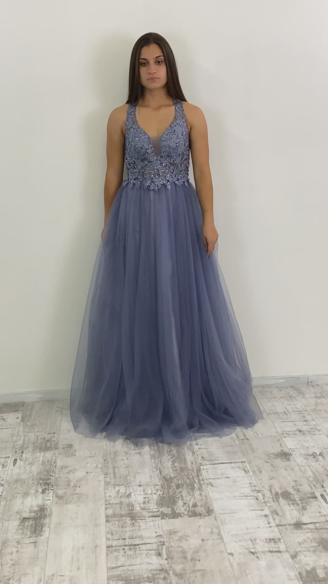 Abito lungo gonna in tulle e corpetto in pizzo e brillantini.