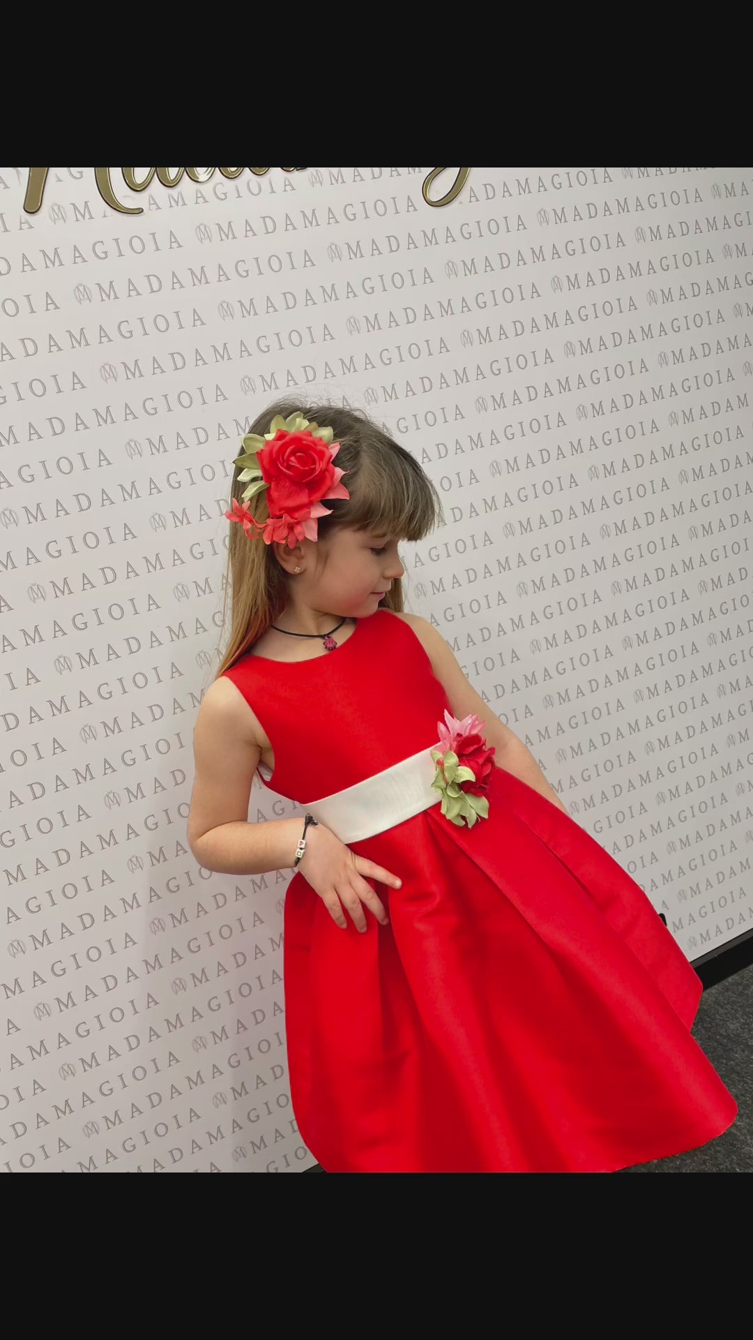 Abito tinta unita in tessuto rigido con gonna a cannelli e fascia bianca in vita con spilla di fiori rossi.